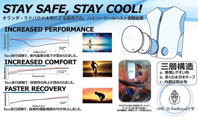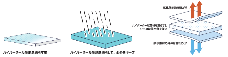 HYPERKEWLTM「ハイパークール」とは、米国「TECHNICHE」社が開発・製造する、衣服裏等に使用して、水が蒸発するときの気化熱によって、長時間にわたり身体をやさしく冷やすことができる、特殊な布地です。