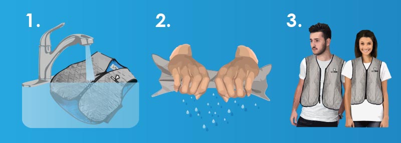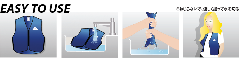 3.) 表面に付いた水滴をタオルなどで拭ってから着用して下さい(ベストの内側は撥水加工で濡れにくく、 Tシャツ等の上に着用する事が可能です)